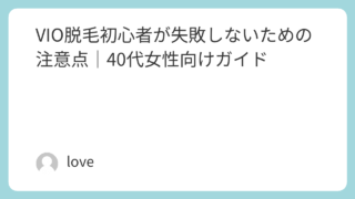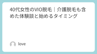 VIO脱毛 40代女性のVIO脱毛|介護脱毛も含めた体験談と始めるタイミング 「VIO脱毛、40代からでも大丈夫?」と思っているあなたへ40代でVIO脱毛を考えると、「まだ始めるのは早い?」「恥ずか... 2025.09.12 VIO脱毛介護脱毛