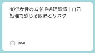 体験談 40代女性のムダ毛処理事情|自己処理で感じる限界とリスク 「ムダ毛の処理、最近ちょっとしんどいな…」そう感じることはありませんか?20代や30代の頃は、シェーバーや除毛クリームで... 2025.09.27 体験談